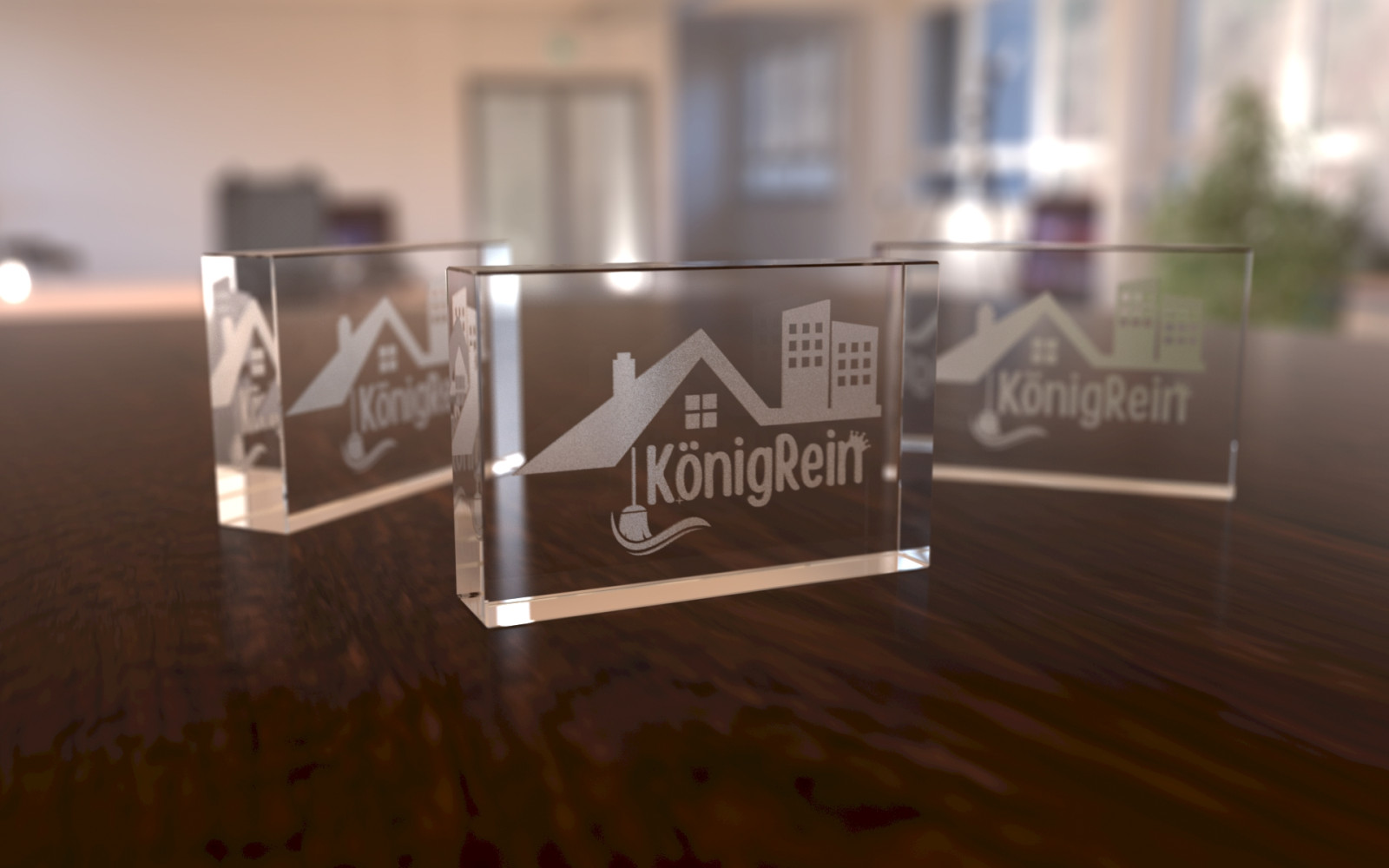 Mithilfe der Sandstrahltechnik erzeugen wir präzise Konturen, die beeindruckende optische Effekte schaffen. So können beispielsweise filigrane Details oder ein optischer Sockel herausgearbeitet werden, der sich ideal für einen farbigen Logodruck eignet.